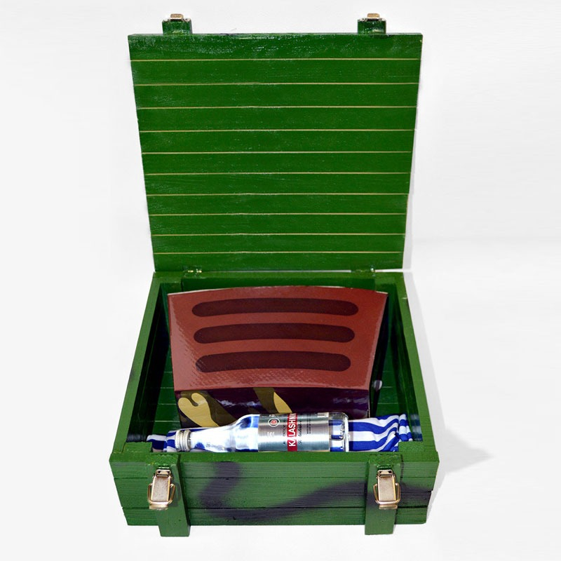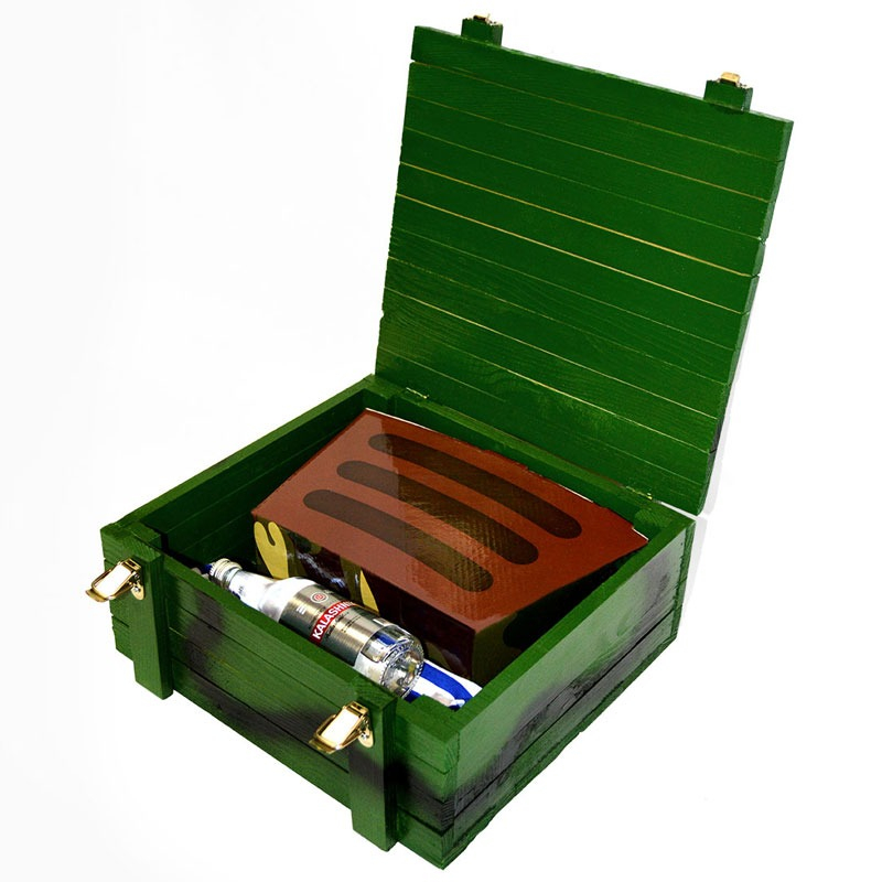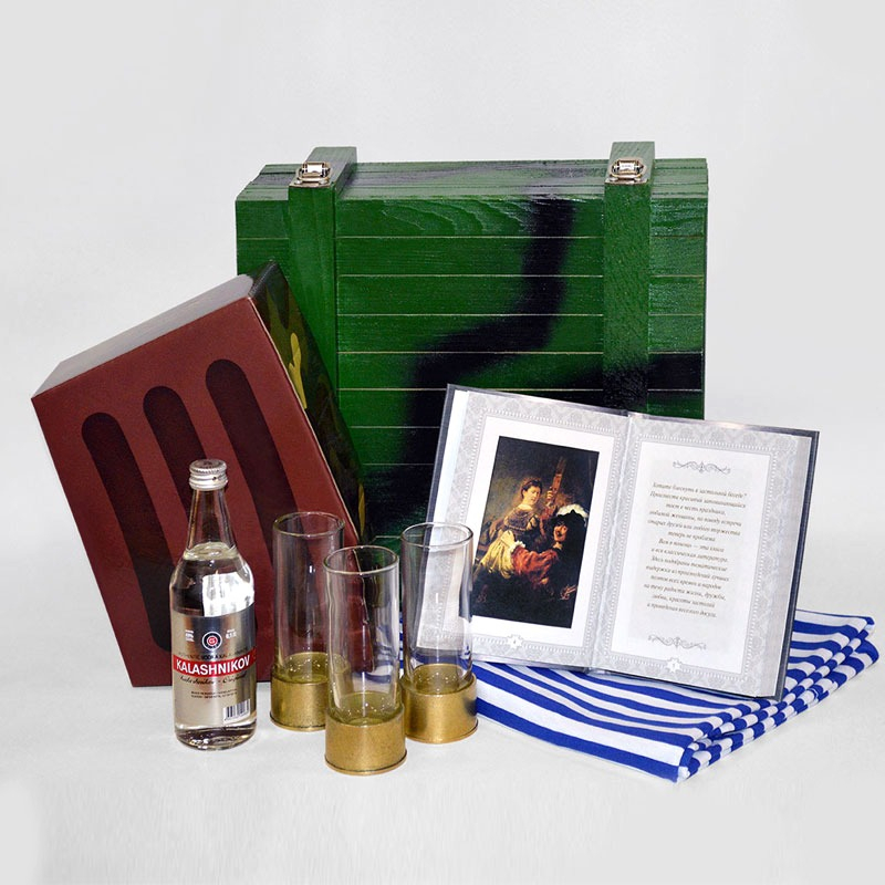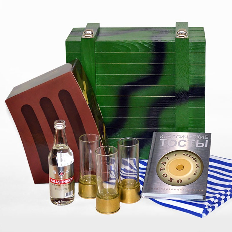 Патроны - не просто сувенир, настоящие мужские стопки. Калибра 60 мл. А ещё книга "Тосты" - в едином дизайне со стопками - отличный подарочный экземпляр. В ней всё, что необходимо, чтобы расцветить любой незамысловатый тост - стихи, афоризмы, цитаты. Эти дополнения сделают речь любого тостующего выступлением опытного тамады. А ещё тельняшка и Калашников. И всё это находится в стильном коробе-ящике, стилизованном под ящик с патронами.