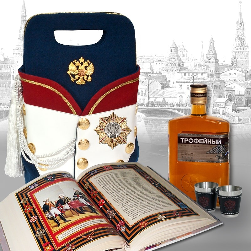 Подарочный набор "Фельдмаршал" - это оригинальный подарок для людей, которые чтут традиции России, её победы и достижения. Внешний вид упаковки (кофр) стилизован под военную униформу российской армии 1812 года (офицерский мундир). Такой подход позволил придать подарку неповторимость и очень оригинальный вид. Кофр универсален, он может вмещать в себя любые подходящие по размеру подарки. Продукция уникальна, аналогов нет, это собственная разработка нашей компании.